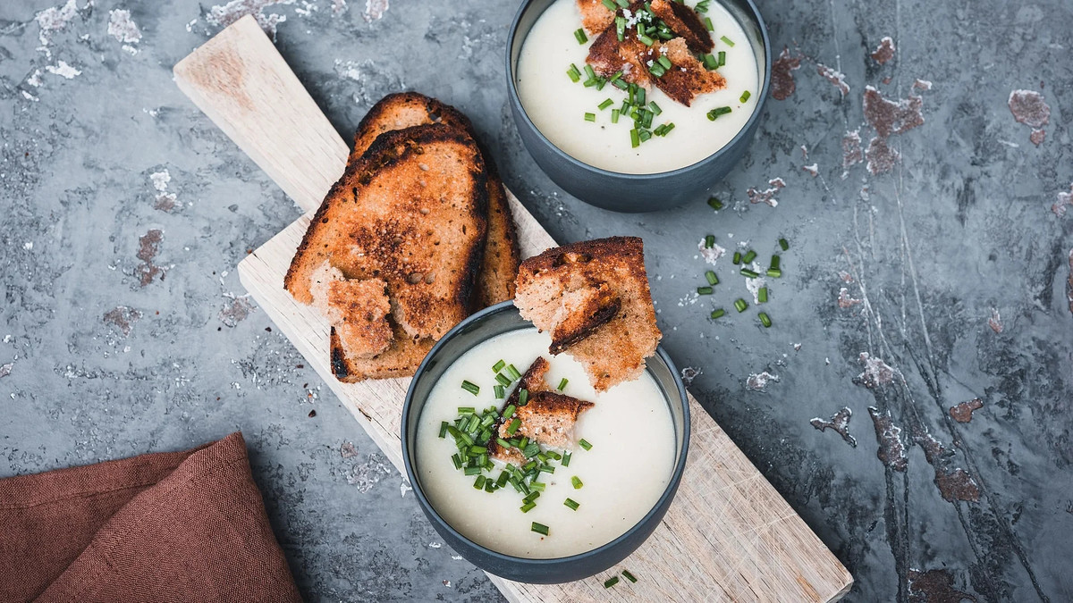 Olupite in drobno narežite čebulo in česen. Oboje dodamo v ponev in na zmernem ognju prepražimo na malo masla. Cvetačo operemo in očistimo, odstranimo pecelj in razdelimo na cvetove. Cvetke damo v ponev, zalijemo z zelenjavno osnovo in zavremo. Dodamo limonin sok, juho začinimo s ščepcem soli in popra ter kuhamo 3 minute. Kruh na močnem ognju v rahlo naoljeni ponvi cvremo 15–30 sekund na vsaki strani, da hrustljavo zapeče. Juhi dodamo smetano, jo ponovno na kratko zavremo in pretlačimo v pire z mešalnikom. Juho razdelimo na dva krožnika in potresemo s sesekljanim drobnjakom. Kruh nalomimo na koščke in postrežemo k juhi.